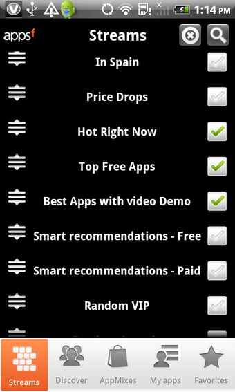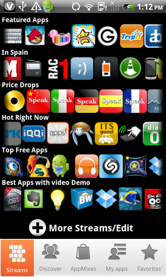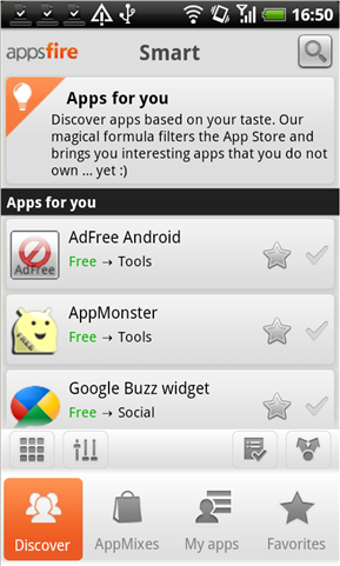 Appsfire heeft echter nog meer in petto. Je navigeert met de knoppen onderin: de reeds beschreven muur bereik je via Streams, maar met Discover open je lijsten met aanraders. Deze zogenaamde 'smart recommendations' zijn gebaseerd op de apps die al op je Android telefoon staan. Ook vind je hier applicaties die handig zijn in jouw eigen stad; denk bijvoorbeeld aan apps voor het openbaar vervoer.